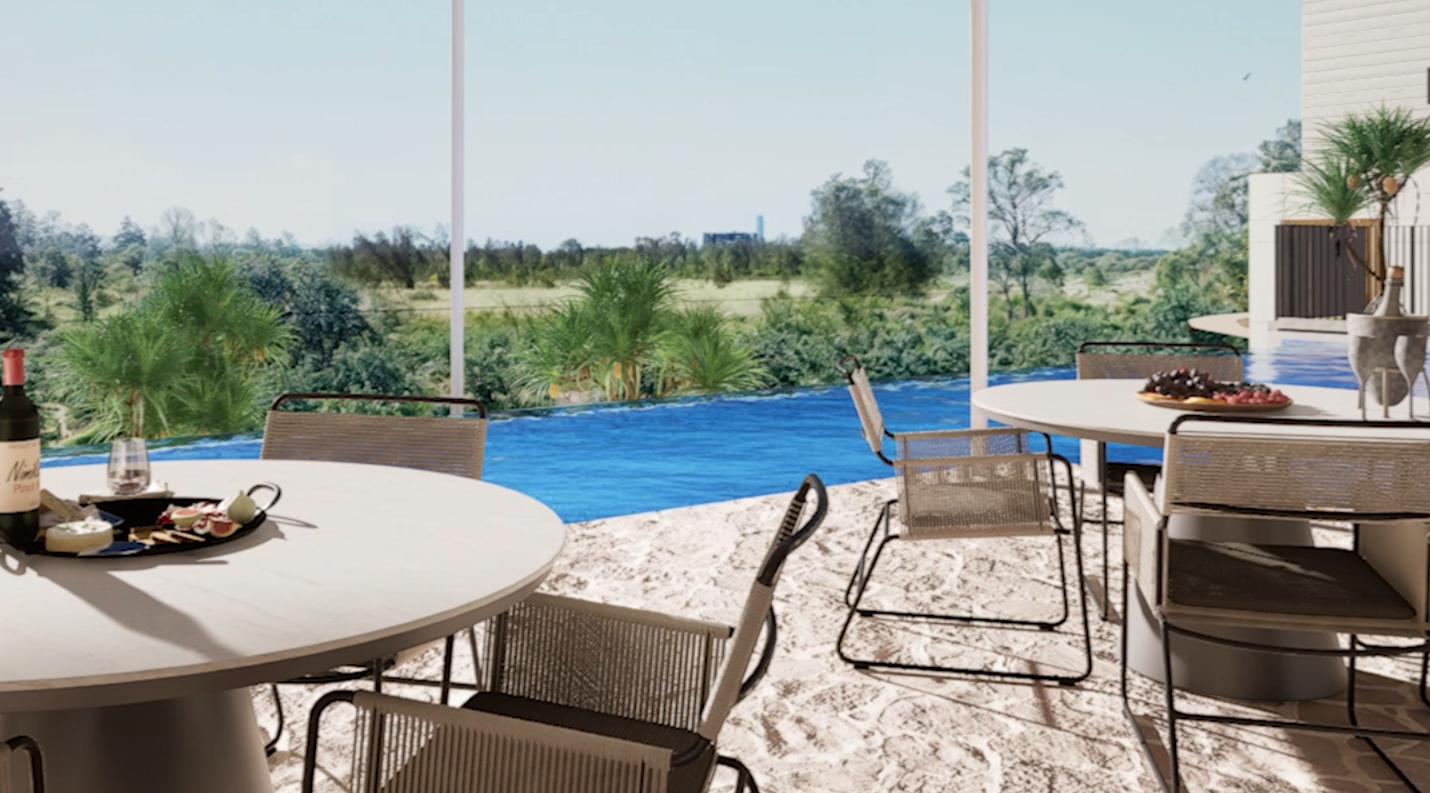 Lifestyle amenity is anchored by the Infinity Terrace, an elevated communal space incorporating a 20m heated pool, alfresco zones and barbecue facilities, designed as a shared retreat within the neighbourhood. A two-acre private nature reserve with walking trails and rehabilitated bushland further integrates the development with its savanna-edge setting, reflecting a broader masterplan initiative to restore native vegetation and habitat corridors.